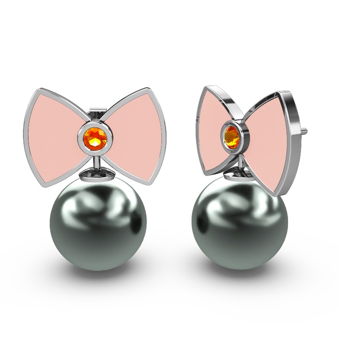 Siyah inci ve sitrin 14 ayar beyaz altın küpe (Pastel pembe mineli)