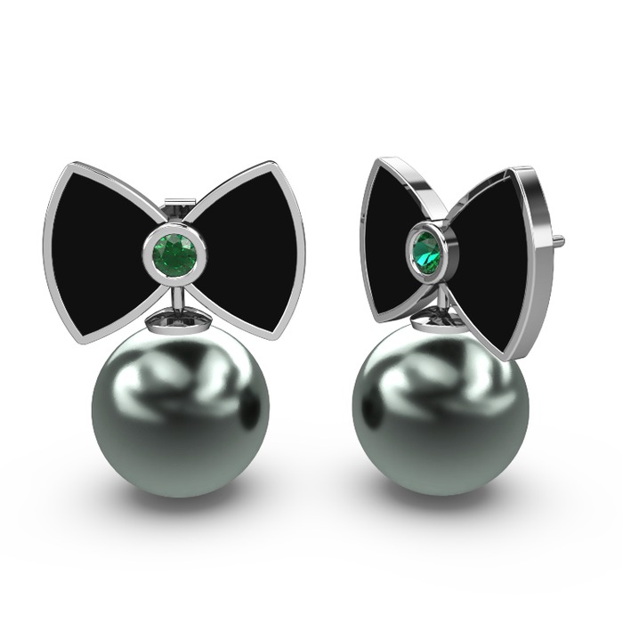 Siyah inci ve yeşil kuvars 14 ayar beyaz altın küpe (Siyah mineli)