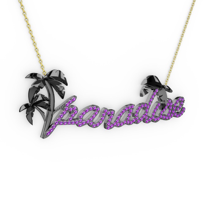 Ametist 925 ayar siyah rodyum kaplama gümüş kolye (40 cm altın rolo zincir)
