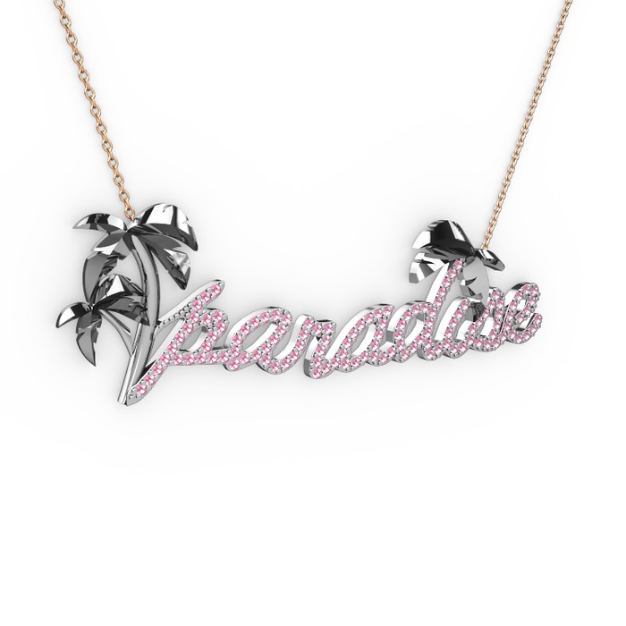 Pembe kuvars 14 ayar beyaz altın kolye (40 cm rose altın rolo zincir)
