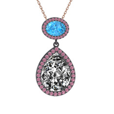 Akuamarin ve pembe kuvars 925 ayar siyah rodyum kaplama gümüş kolye (40 cm altın rolo zincir)