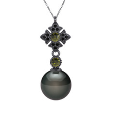 Peridot ve pırlanta 925 ayar siyah rodyum kaplama gümüş kolye (0.44 karat, 40 cm altın rolo zincir)