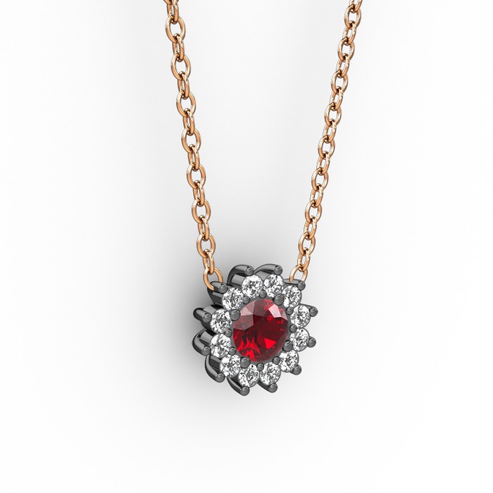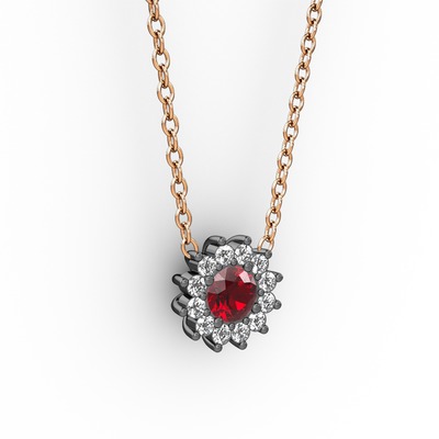 Garnet ve pırlanta 925 ayar siyah rodyum kaplama gümüş kolye (0.1056 karat, 40 cm rose altın rolo zincir)