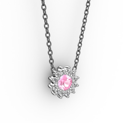 Pembe kuvars ve pırlanta 8 ayar beyaz altın kolye (0.1056 karat, 40 cm gümüş rolo zincir)