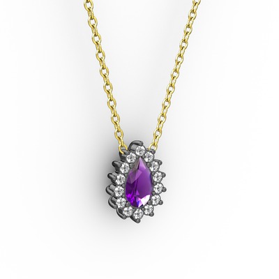 Pırlanta ve ametist 925 ayar siyah rodyum kaplama gümüş kolye (0.1232 karat, 40 cm altın rolo zincir)