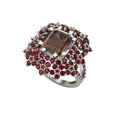 Dumanlı kuvars ve garnet 8 ayar beyaz altın yüzük