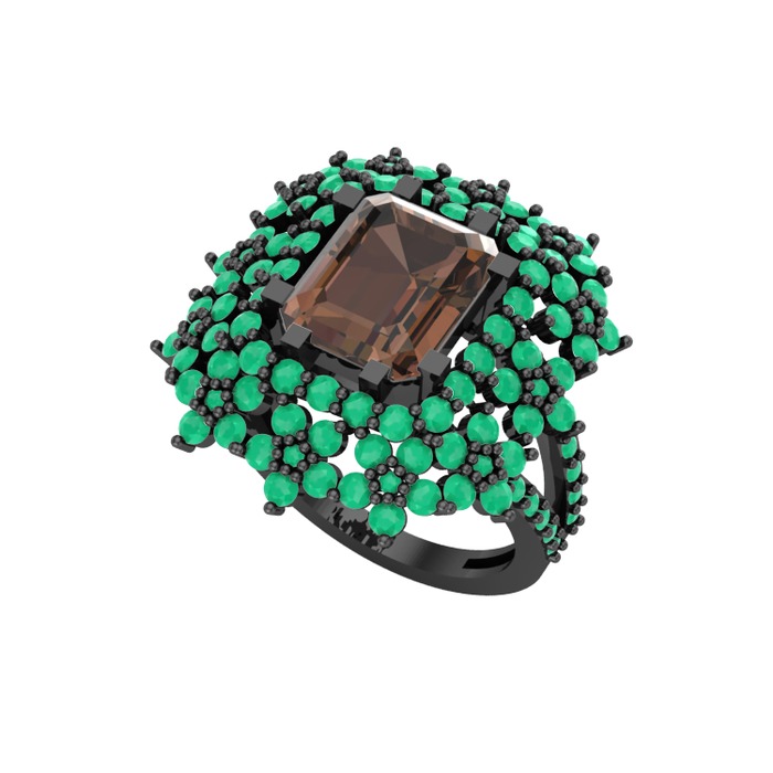 Dumanlı kuvars ve kök zümrüt 925 ayar siyah rodyum kaplama gümüş yüzük