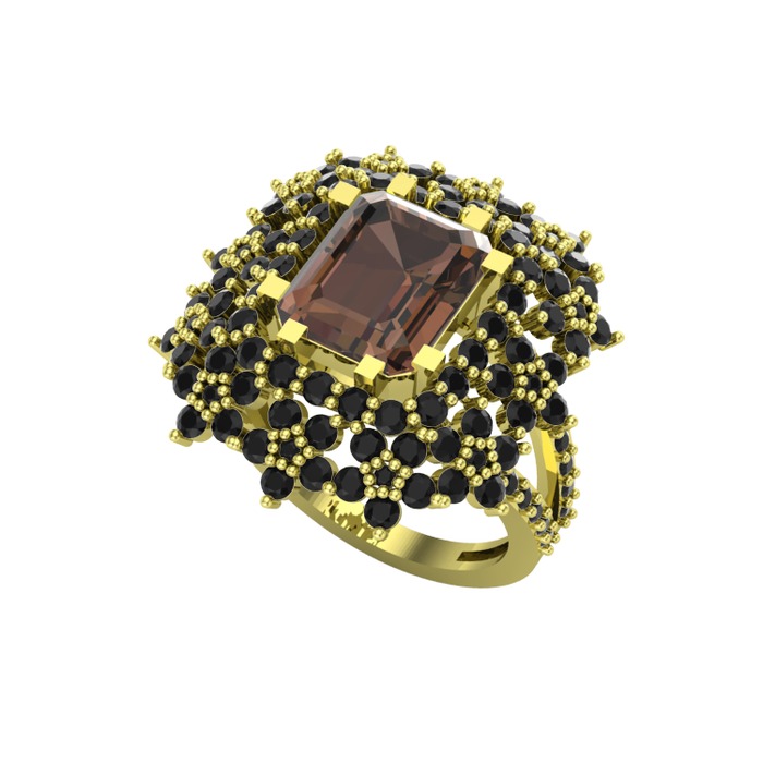 Dumanlı kuvars ve siyah zirkon 18 ayar altın yüzük