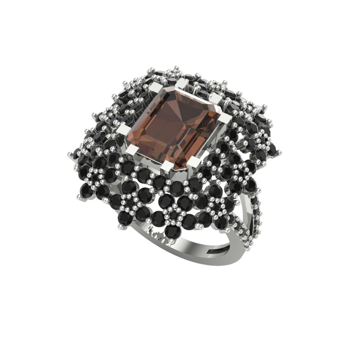 Dumanlı kuvars ve siyah zirkon 8 ayar beyaz altın yüzük