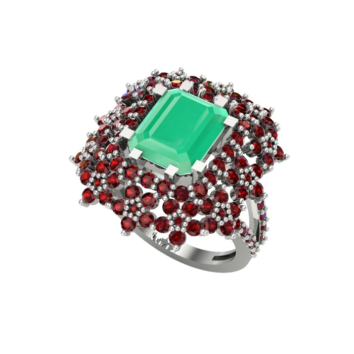 Kök zümrüt ve garnet 18 ayar beyaz altın yüzük