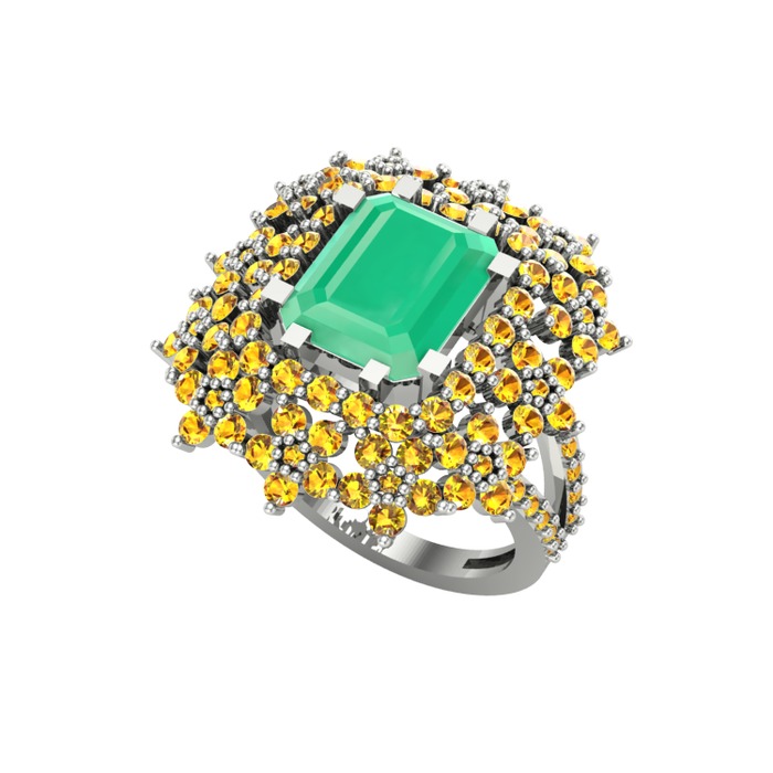 Kök zümrüt ve sitrin 14 ayar beyaz altın yüzük