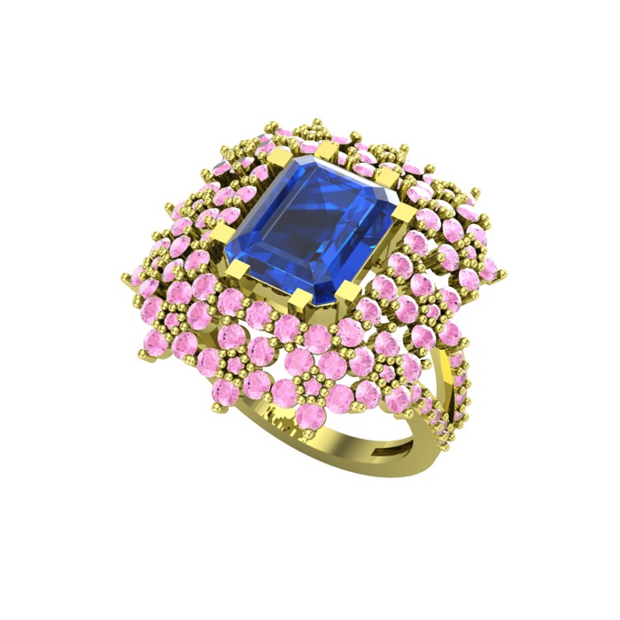 Lab safir ve pembe kuvars 925 ayar altın kaplama gümüş yüzük