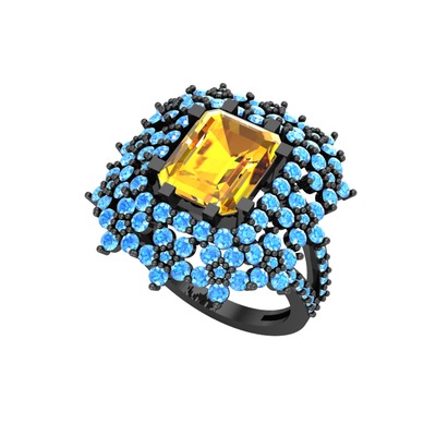 Sitrin ve akuamarin 925 ayar siyah rodyum kaplama gümüş yüzük