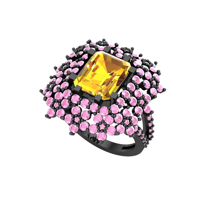 Sitrin ve pembe kuvars 925 ayar siyah rodyum kaplama gümüş yüzük