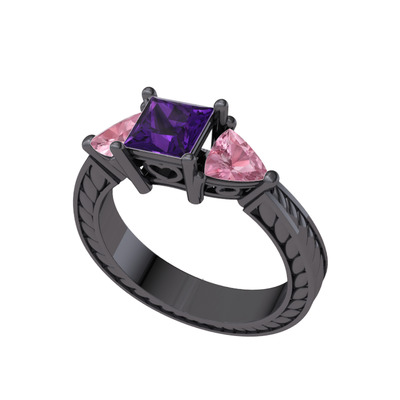 Ametist ve pembe kuvars 925 ayar siyah rodyum kaplama gümüş yüzük