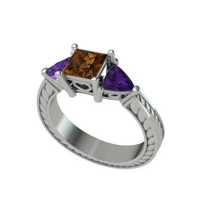 Dumanlı kuvars ve ametist 8 ayar beyaz altın yüzük