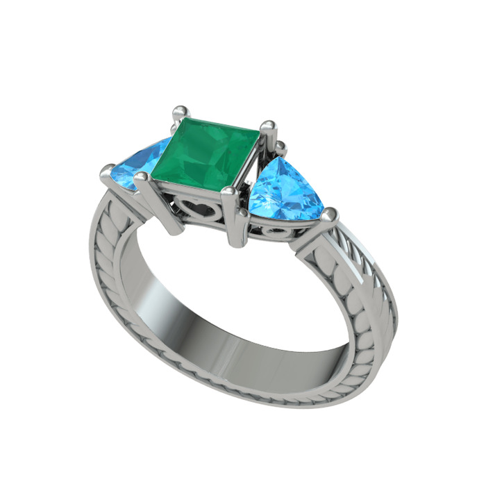 Kök zümrüt ve akuamarin 8 ayar beyaz altın yüzük