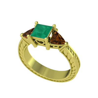 Kök zümrüt ve dumanlı kuvars 14 ayar altın yüzük
