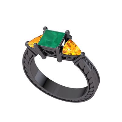 Kök zümrüt ve sitrin 925 ayar siyah rodyum kaplama gümüş yüzük