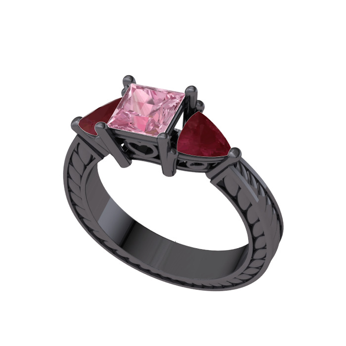 Pembe kuvars ve kök yakut 925 ayar siyah rodyum kaplama gümüş yüzük