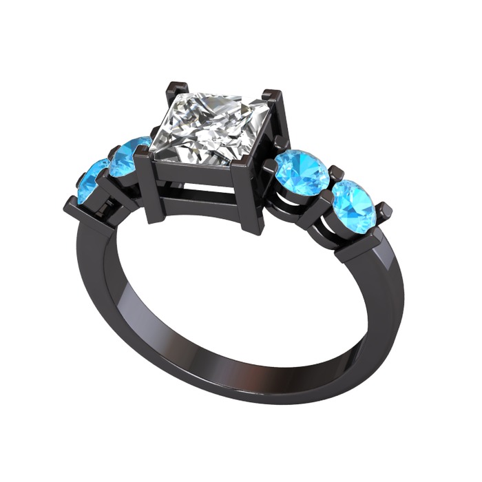Beyaz zirkon ve akuamarin 925 ayar siyah rodyum kaplama gümüş yüzük