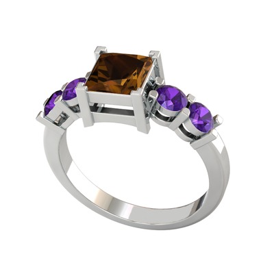 Dumanlı kuvars ve ametist 18 ayar beyaz altın yüzük