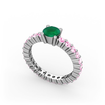 Kök zümrüt ve pembe kuvars 14 ayar beyaz altın yüzük