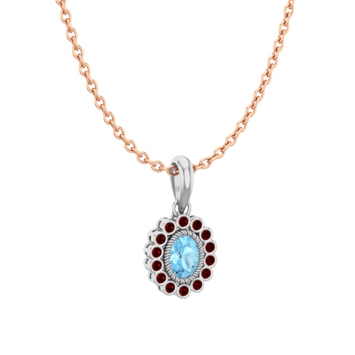 Akuamarin ve garnet 925 ayar gümüş kolye (40 cm rose altın rolo zincir)