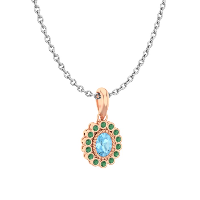 Akuamarin ve kök zümrüt 14 ayar rose altın kolye (40 cm beyaz altın rolo zincir)