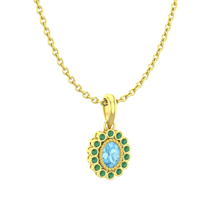 Akuamarin ve kök zümrüt 18 ayar altın kolye (40 cm gümüş rolo zincir)