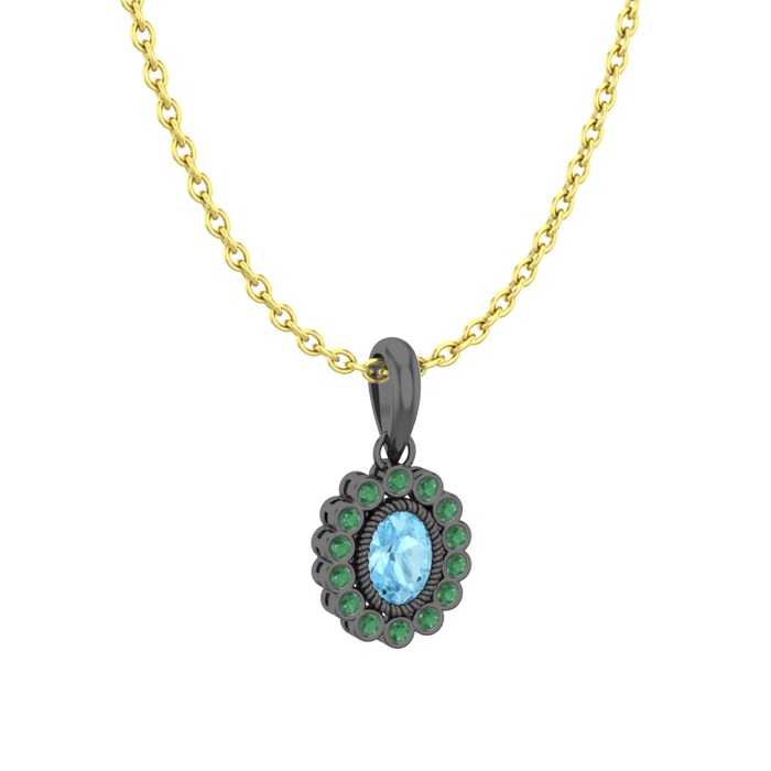 Akuamarin ve kök zümrüt 925 ayar siyah rodyum kaplama gümüş kolye (40 cm gümüş rolo zincir)