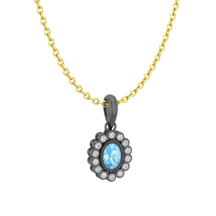 Akuamarin ve swarovski 925 ayar siyah rodyum kaplama gümüş kolye (40 cm altın rolo zincir)