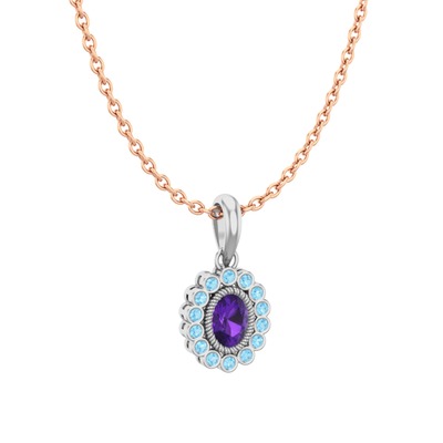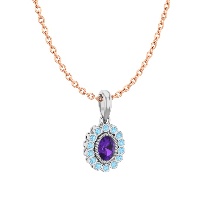 Ametist ve akuamarin 18 ayar beyaz altın kolye (40 cm rose altın rolo zincir)