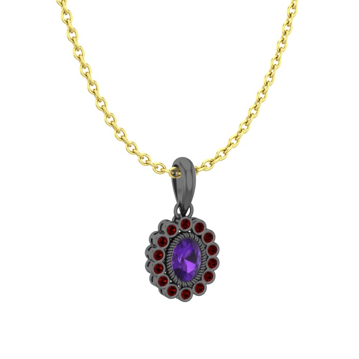 Ametist ve garnet 925 ayar siyah rodyum kaplama gümüş kolye (40 cm altın rolo zincir)