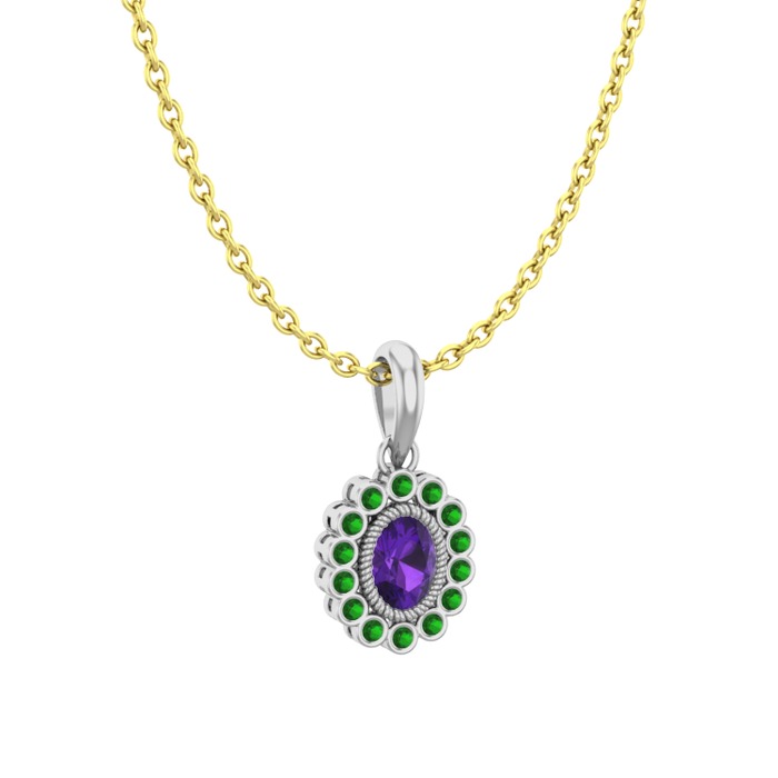 Ametist ve yeşil kuvars 18 ayar beyaz altın kolye (40 cm altın rolo zincir)