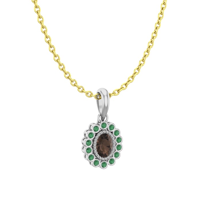 Dumanlı kuvars ve kök zümrüt 18 ayar beyaz altın kolye (40 cm altın rolo zincir)