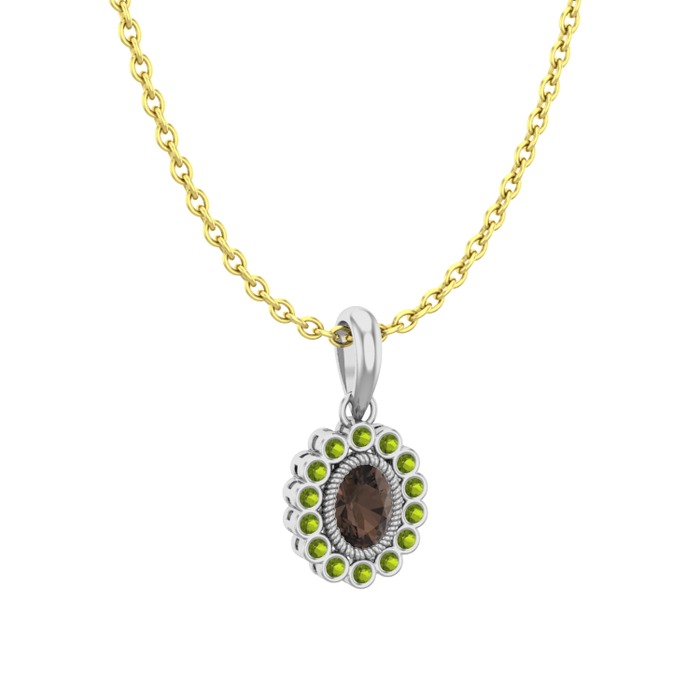 Dumanlı kuvars ve peridot 14 ayar beyaz altın kolye (40 cm gümüş rolo zincir)