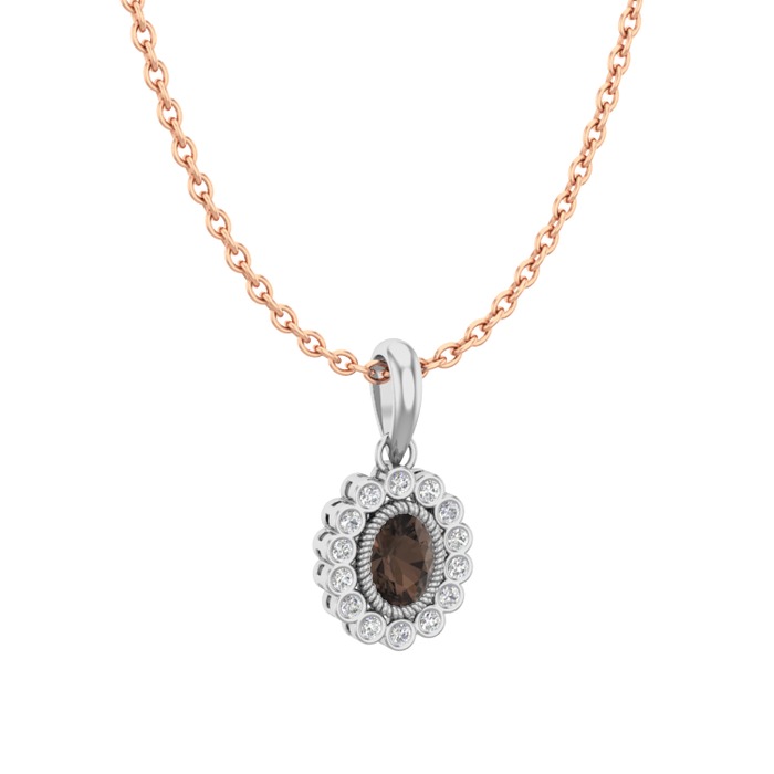 Dumanlı kuvars ve pırlanta 8 ayar beyaz altın kolye (0.154 karat, 40 cm rose altın rolo zincir)