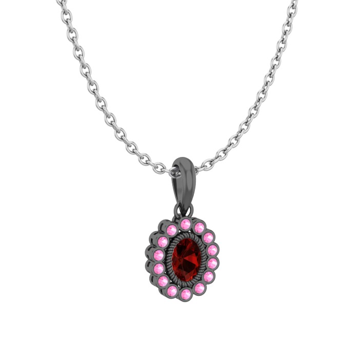 Garnet ve pembe kuvars 925 ayar siyah rodyum kaplama gümüş kolye (40 cm beyaz altın rolo zincir)