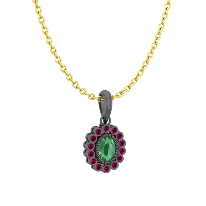 Kök zümrüt ve rodolit garnet 925 ayar siyah rodyum kaplama gümüş kolye (40 cm gümüş rolo zincir)