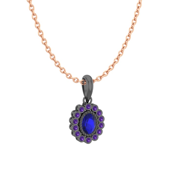 Lab safir ve ametist 925 ayar siyah rodyum kaplama gümüş kolye (40 cm rose altın rolo zincir)
