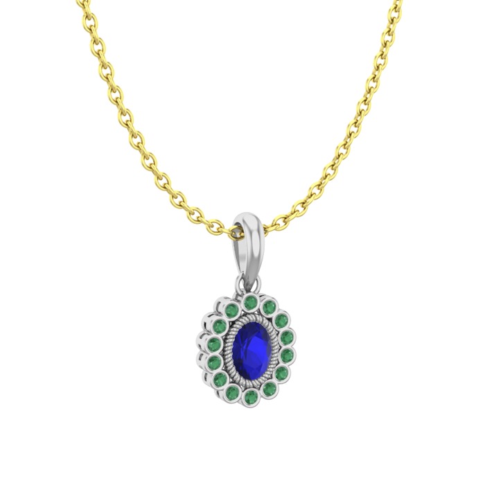 Lab safir ve kök zümrüt 8 ayar beyaz altın kolye (40 cm gümüş rolo zincir)