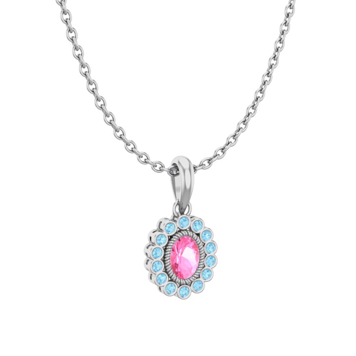 Pembe kuvars ve akuamarin 8 ayar beyaz altın kolye (40 cm gümüş rolo zincir)