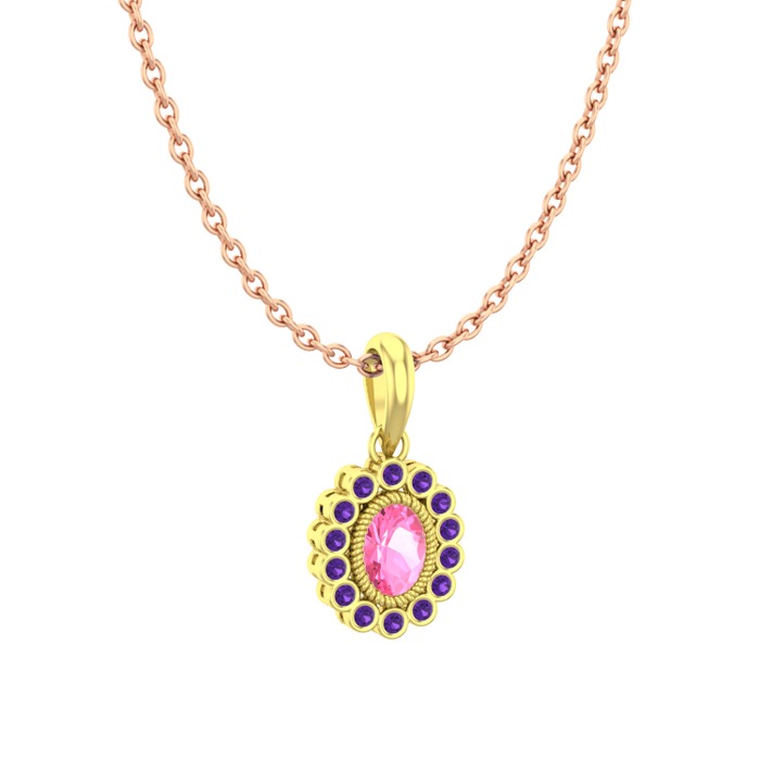 Pembe kuvars ve ametist 8 ayar altın kolye (40 cm rose altın rolo zincir)