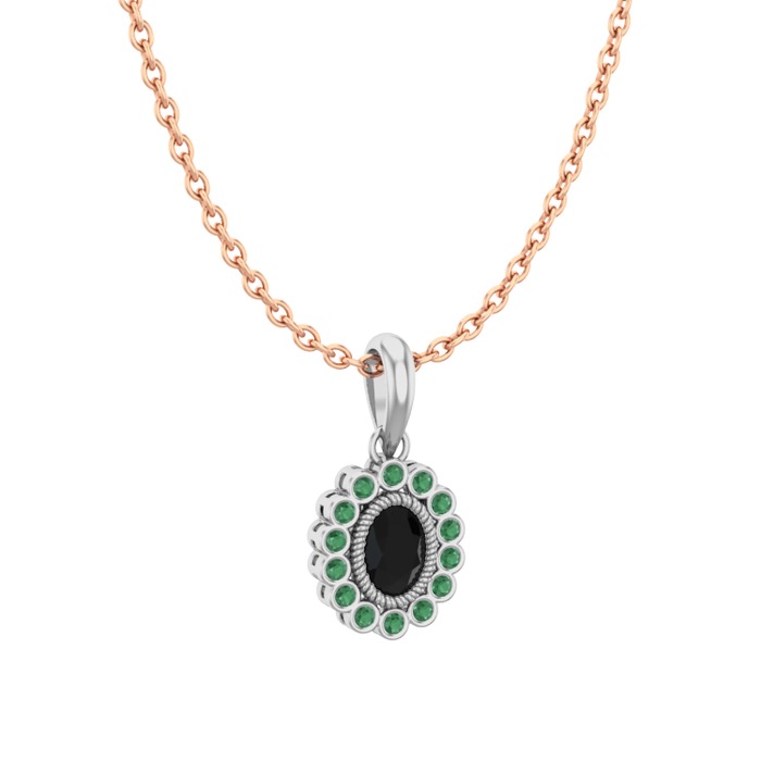 Siyah zirkon ve kök zümrüt 14 ayar beyaz altın kolye (40 cm rose altın rolo zincir)