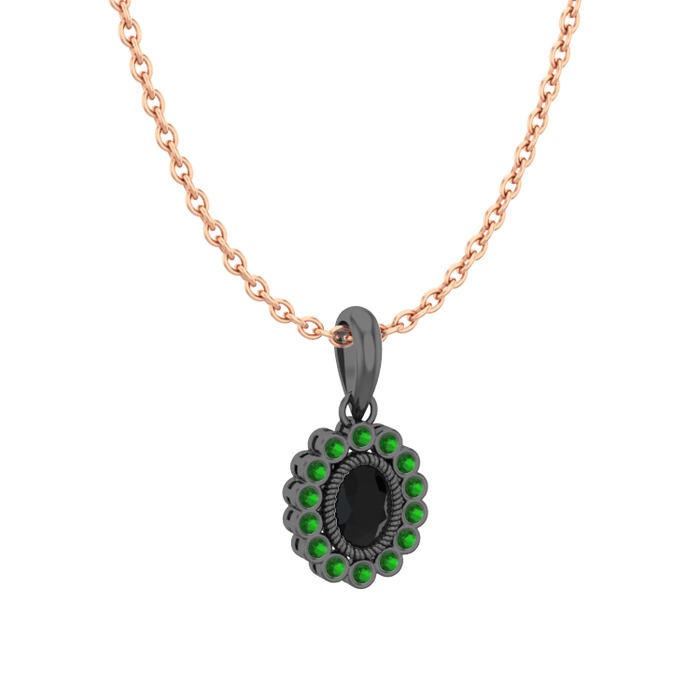 Siyah zirkon ve yeşil kuvars 925 ayar siyah rodyum kaplama gümüş kolye (40 cm rose altın rolo zincir)