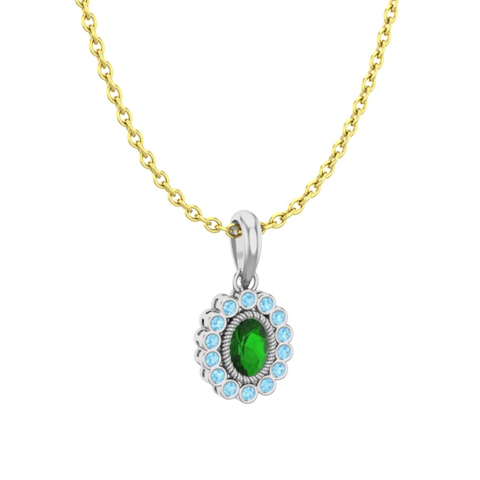Yeşil kuvars ve akuamarin 8 ayar beyaz altın kolye (40 cm gümüş rolo zincir)