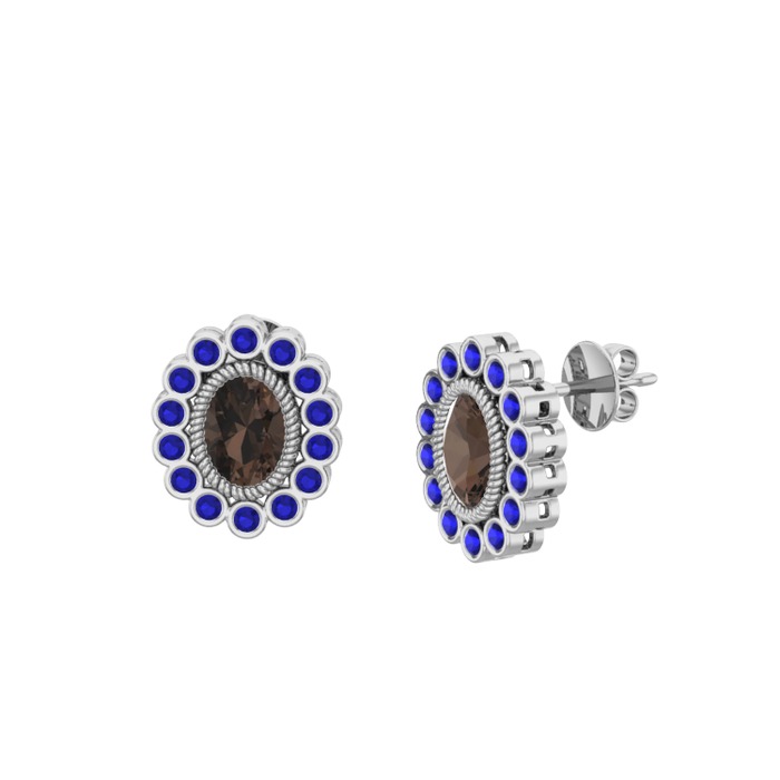 Dumanlı kuvars ve lab safir 14 ayar beyaz altın küpe