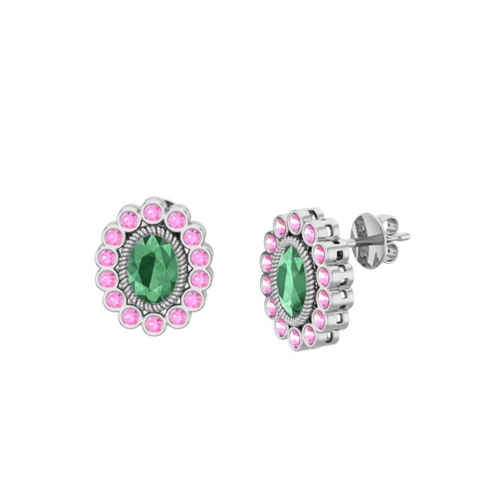 Kök zümrüt ve pembe kuvars 18 ayar beyaz altın küpe
