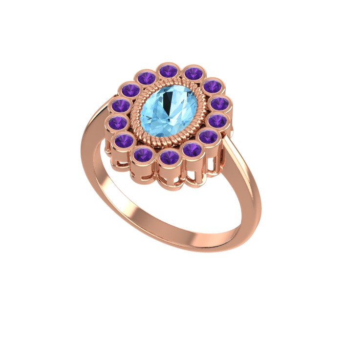 Akuamarin ve ametist 14 ayar rose altın yüzük